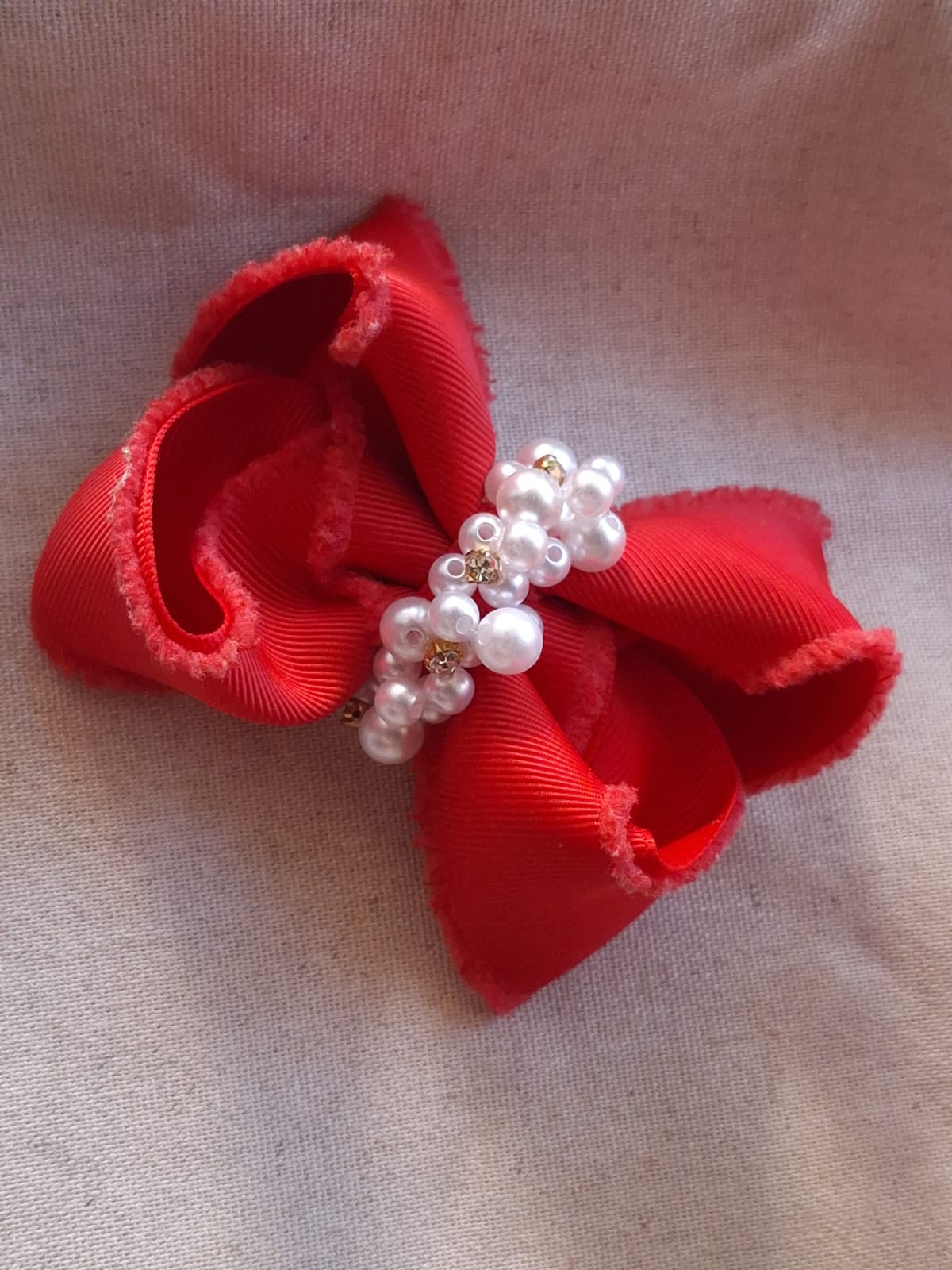 Laço Boutique confeccionado com fita de gorgurão decorada e chuva de pérola bordado à mão.